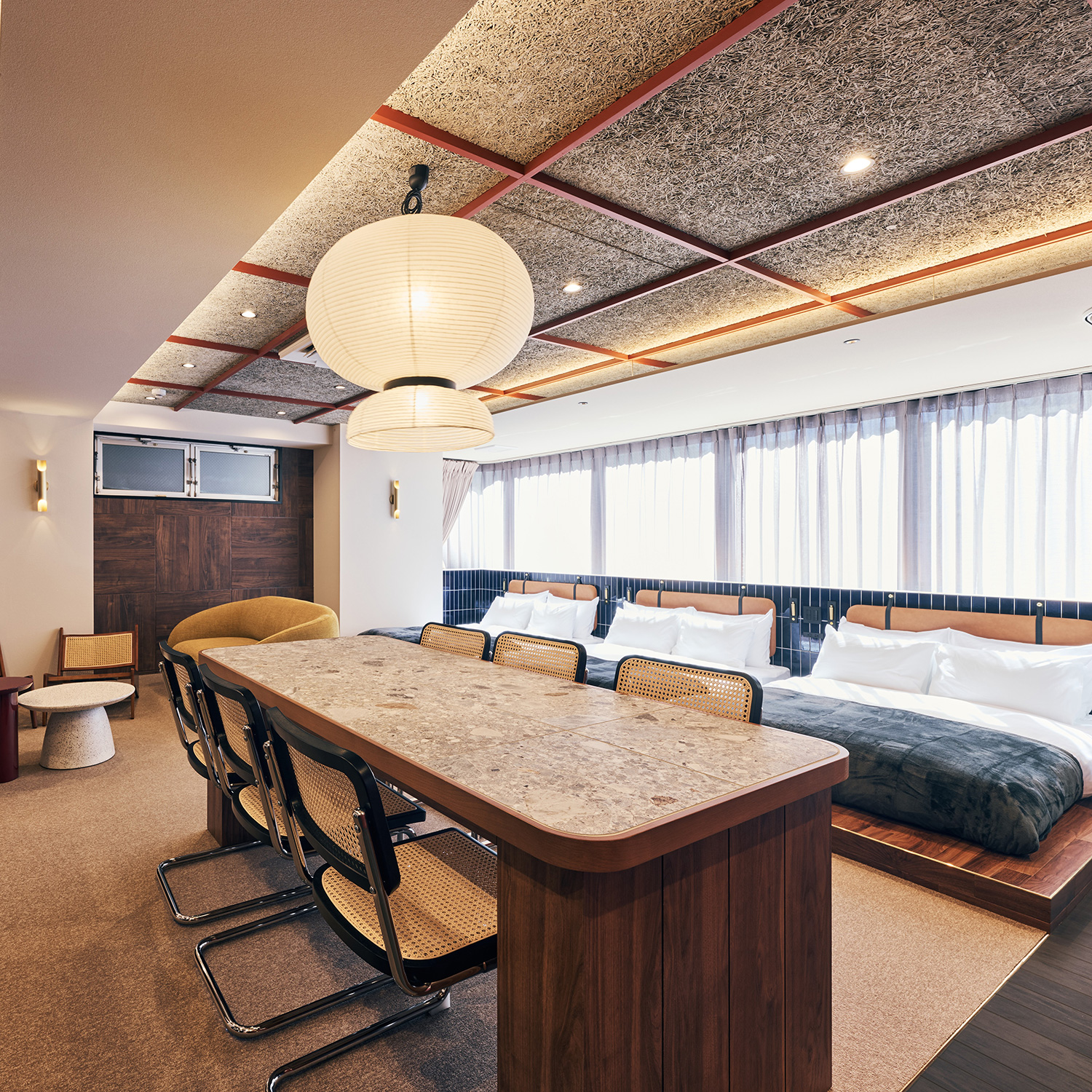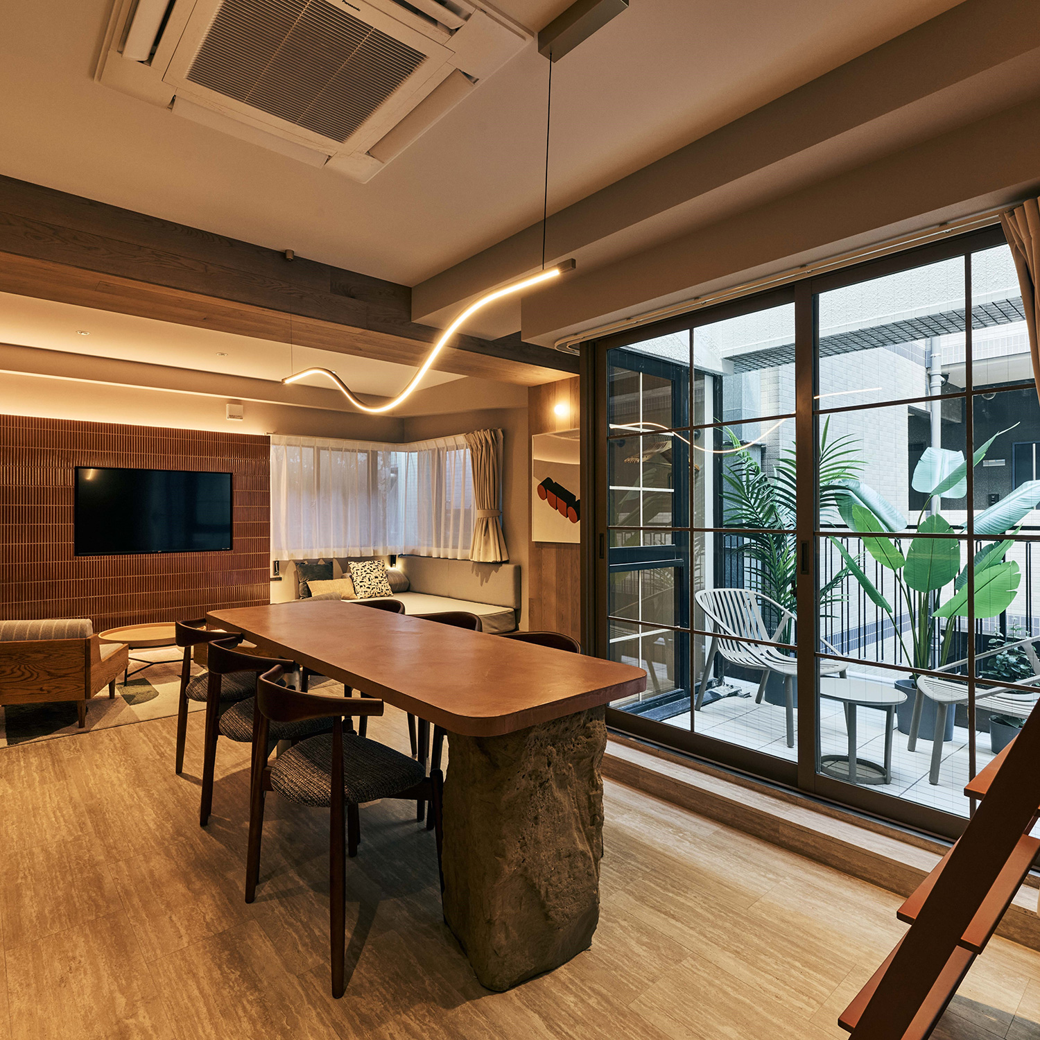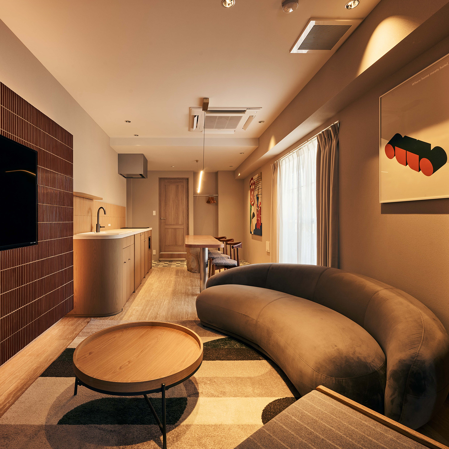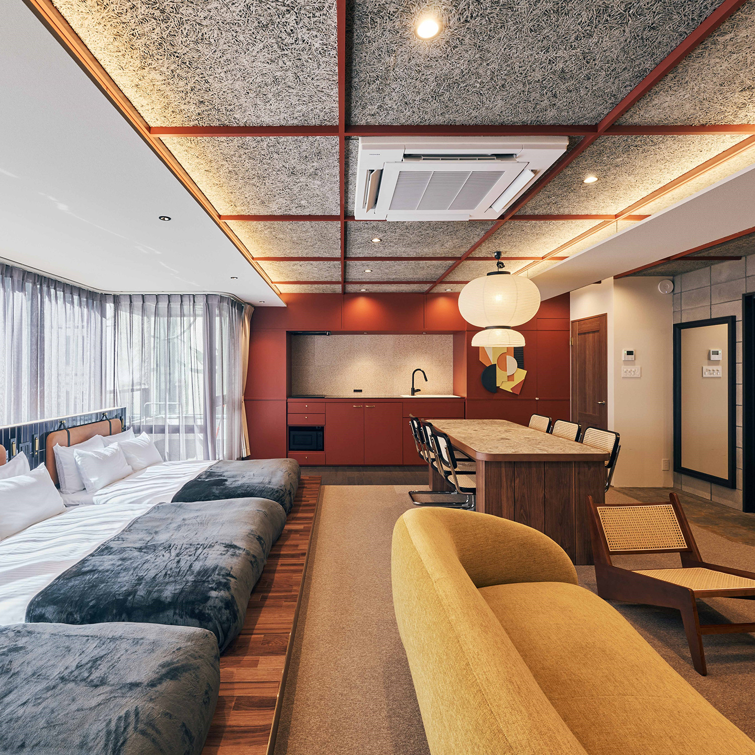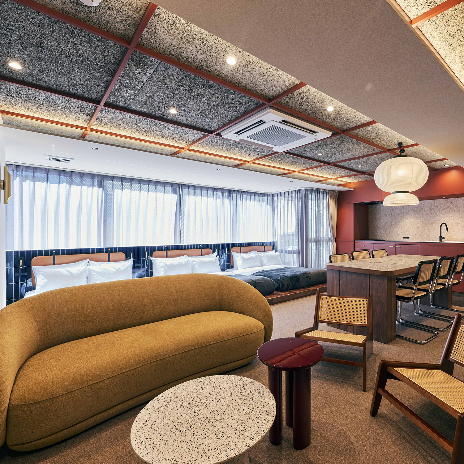 Rooted in mid-century modern style, this vibrant retreat brings together bold, uplifting colors, rustic block-tile walls, and the gentle warmth of wooden lattice ceilings. The space is thoughtfully zoned- with dining and lounge areas that wrap around the heart of the home- creating a natural flow that sparks conversation and connection. Just moments from the buzz of Shinsaibashi, it’s a place where you can soak up the energy of Osaka, then return to a space that feels entirely your own. A perfect base for travelers who want both inspiration and intimacy in their journey.